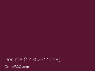 Decimal 14362711058 Color is a very dark rose color and the nearest color is Wine Berry #591d35. Hex code #591434 and RGB value is rgb(89,20,52). In RGB color space, this color is composed of 35% red, 8% green, 20% blue, In CMYK color space, this color is composed of 0% cyan, 78% magenta, 42% yellow , 65% black , In HSL color space, this color has a hue angle of 332° , 63% saturation and 21% lightness.