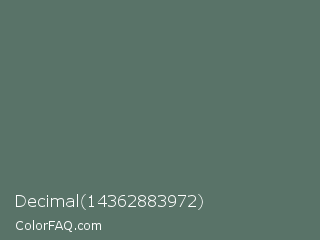 Decimal 14362883972 Color is a normal green color and the nearest color is Corduroy #606e68. Hex code #597368 and RGB value is rgb(89,115,104). In RGB color space, this color is composed of 35% red, 45% green, 41% blue, In CMYK color space, this color is composed of 23% cyan, 0% magenta, 10% yellow , 55% black , In HSL color space, this color has a hue angle of 155° , 13% saturation and 40% lightness.
