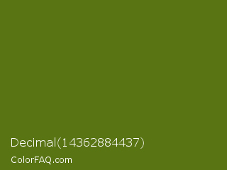 Decimal 14362884437 Color is a dark lime color and the nearest color is Fern Frond #657220. Hex code #597413 and RGB value is rgb(89,116,19). In RGB color space, this color is composed of 35% red, 45% green, 7% blue, In CMYK color space, this color is composed of 23% cyan, 0% magenta, 84% yellow , 55% black , In HSL color space, this color has a hue angle of 77° , 72% saturation and 26% lightness.