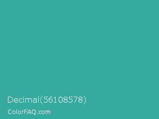Decimal 56108578 Color is a normal cyan color and the nearest color is Keppel #3ab09e. Hex code #36aa9e and RGB value is rgb(54,170,158). In RGB color space, this color is composed of 21% red, 67% green, 62% blue, In CMYK color space, this color is composed of 68% cyan, 0% magenta, 7% yellow , 33% black , In HSL color space, this color has a hue angle of 174° , 52% saturation and 44% lightness.