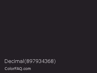 Decimal 897934368 Color is a very dark purple color and the nearest color is Raisin Black #242124. Hex code #232024 and RGB value is rgb(35,32,36). In RGB color space, this color is composed of 14% red, 13% green, 14% blue, In CMYK color space, this color is composed of 3% cyan, 11% magenta, 0% yellow , 86% black , In HSL color space, this color has a hue angle of 285° , 6% saturation and 13% lightness.