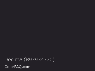 Decimal 897934370 Color is a very dark violet color and the nearest color is Raisin Black #242124. Hex code #232026 and RGB value is rgb(35,32,38). In RGB color space, this color is composed of 14% red, 13% green, 15% blue, In CMYK color space, this color is composed of 8% cyan, 16% magenta, 0% yellow , 85% black , In HSL color space, this color has a hue angle of 270° , 9% saturation and 14% lightness.