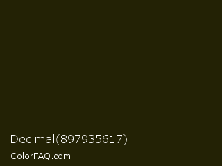 Decimal 897935617 Color is a almost black yellow color and the nearest color is Cannon Black #251706. Hex code #232205 and RGB value is rgb(35,34,5). In RGB color space, this color is composed of 14% red, 13% green, 2% blue, In CMYK color space, this color is composed of 0% cyan, 3% magenta, 86% yellow , 86% black , In HSL color space, this color has a hue angle of 58° , 75% saturation and 8% lightness.