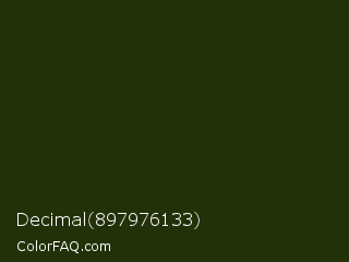 Decimal 897976133 Color is a very dark green color and the nearest color is Turtle Green #2a380b. Hex code #233109 and RGB value is rgb(35,49,9). In RGB color space, this color is composed of 14% red, 19% green, 4% blue, In CMYK color space, this color is composed of 29% cyan, 0% magenta, 82% yellow , 81% black , In HSL color space, this color has a hue angle of 81° , 69% saturation and 11% lightness.