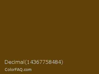Decimal 14367758484 Color is a very dark orange color and the nearest color is Pineapple #563c0d. Hex code #604206 and RGB value is rgb(96,66,6). In RGB color space, this color is composed of 38% red, 26% green, 2% blue, In CMYK color space, this color is composed of 0% cyan, 31% magenta, 94% yellow , 62% black , In HSL color space, this color has a hue angle of 40° , 88% saturation and 20% lightness.