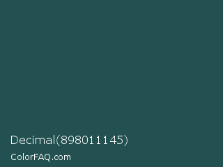 Decimal 898011145 Color is a dark cyan color and the nearest color is Plantation #27504b. Hex code #235151 and RGB value is rgb(35,81,81). In RGB color space, this color is composed of 14% red, 32% green, 32% blue, In CMYK color space, this color is composed of 57% cyan, 0% magenta, 0% yellow , 68% black , In HSL color space, this color has a hue angle of 180° , 40% saturation and 23% lightness.