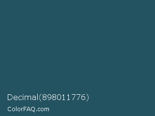 Decimal 898011776 Color is a dark blue color and the nearest color is Spectra #2f5a57. Hex code #235260 and RGB value is rgb(35,82,96). In RGB color space, this color is composed of 14% red, 32% green, 38% blue, In CMYK color space, this color is composed of 64% cyan, 15% magenta, 0% yellow , 62% black , In HSL color space, this color has a hue angle of 194° , 47% saturation and 26% lightness.