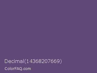 Decimal 14368207669 Color is a normal purple color and the nearest color is Cyber Grape #58427c. Hex code #614977 and RGB value is rgb(97,73,119). In RGB color space, this color is composed of 38% red, 29% green, 47% blue, In CMYK color space, this color is composed of 18% cyan, 39% magenta, 0% yellow , 53% black , In HSL color space, this color has a hue angle of 271° , 24% saturation and 38% lightness.