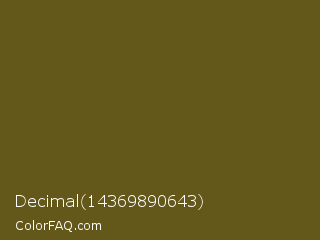 Decimal 14369890643 Color is a dark yellow color and the nearest color is West Coast #625119. Hex code #635819 and RGB value is rgb(99,88,25). In RGB color space, this color is composed of 39% red, 35% green, 10% blue, In CMYK color space, this color is composed of 0% cyan, 11% magenta, 75% yellow , 61% black , In HSL color space, this color has a hue angle of 51° , 60% saturation and 24% lightness.