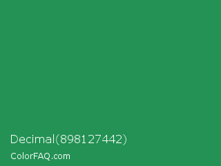 Decimal 898127442 Color is a normal green color and the nearest color is Eucalyptus #278a5b. Hex code #239254 and RGB value is rgb(35,146,84). In RGB color space, this color is composed of 14% red, 57% green, 33% blue, In CMYK color space, this color is composed of 76% cyan, 0% magenta, 42% yellow , 43% black , In HSL color space, this color has a hue angle of 146° , 61% saturation and 35% lightness.