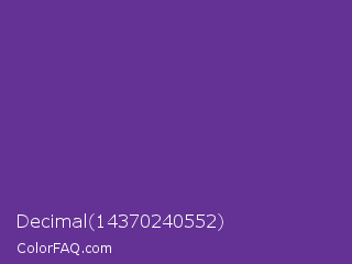 Decimal 14370240552 Color is a normal purple color and the nearest color is Rebecca Purple #663399. Hex code #643194 and RGB value is rgb(100,49,148). In RGB color space, this color is composed of 39% red, 19% green, 58% blue, In CMYK color space, this color is composed of 32% cyan, 67% magenta, 0% yellow , 42% black , In HSL color space, this color has a hue angle of 271° , 50% saturation and 39% lightness.