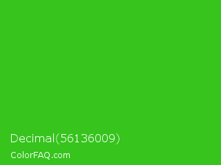Decimal 56136009 Color is a normal green color and the nearest color is Harlequin Green #46cb18. Hex code #36c41d and RGB value is rgb(54,196,29). In RGB color space, this color is composed of 21% red, 77% green, 11% blue, In CMYK color space, this color is composed of 72% cyan, 0% magenta, 85% yellow , 23% black , In HSL color space, this color has a hue angle of 111° , 74% saturation and 44% lightness.