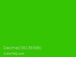 Decimal 56136568 Color is a normal green color and the nearest color is Harlequin Green #46cb18. Hex code #36c502 and RGB value is rgb(54,197,2). In RGB color space, this color is composed of 21% red, 77% green, 1% blue, In CMYK color space, this color is composed of 73% cyan, 0% magenta, 99% yellow , 23% black , In HSL color space, this color has a hue angle of 104° , 98% saturation and 39% lightness.