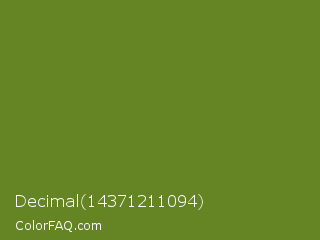 Decimal 14371211094 Color is a normal green color and the nearest color is Olive Drab #6b8e23. Hex code #658524 and RGB value is rgb(101,133,36). In RGB color space, this color is composed of 40% red, 52% green, 14% blue, In CMYK color space, this color is composed of 24% cyan, 0% magenta, 73% yellow , 48% black , In HSL color space, this color has a hue angle of 80° , 57% saturation and 33% lightness.