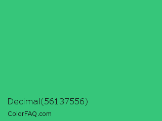 Decimal 56137556 Color is a normal green color and the nearest color is UFO Green #3cd070. Hex code #36c67a and RGB value is rgb(54,198,122). In RGB color space, this color is composed of 21% red, 78% green, 48% blue, In CMYK color space, this color is composed of 73% cyan, 0% magenta, 38% yellow , 22% black , In HSL color space, this color has a hue angle of 148° , 57% saturation and 49% lightness.