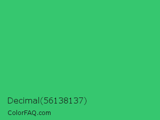 Decimal 56138137 Color is a normal green color and the nearest color is UFO Green #3cd070. Hex code #36c76f and RGB value is rgb(54,199,111). In RGB color space, this color is composed of 21% red, 78% green, 44% blue, In CMYK color space, this color is composed of 73% cyan, 0% magenta, 44% yellow , 22% black , In HSL color space, this color has a hue angle of 144° , 57% saturation and 50% lightness.