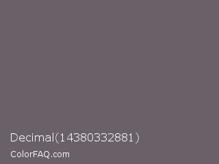 Decimal 14380332881 Color is a normal magenta color and the nearest color is Scorpion #695f62. Hex code #696167 and RGB value is rgb(105,97,103). In RGB color space, this color is composed of 41% red, 38% green, 40% blue, In CMYK color space, this color is composed of 0% cyan, 8% magenta, 2% yellow , 59% black , In HSL color space, this color has a hue angle of 315° , 4% saturation and 40% lightness.