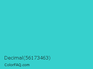 Decimal 56173463 Color is a normal cyan color and the nearest color is Turquoise PWG #30d5c8. Hex code #36d0cd and RGB value is rgb(54,208,205). In RGB color space, this color is composed of 21% red, 82% green, 80% blue, In CMYK color space, this color is composed of 74% cyan, 0% magenta, 1% yellow , 18% black , In HSL color space, this color has a hue angle of 179° , 62% saturation and 51% lightness.