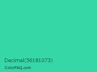 Decimal 56181073 Color is a normal green color and the nearest color is Eucalyptus #44d7a8. Hex code #36d7a7 and RGB value is rgb(54,215,167). In RGB color space, this color is composed of 21% red, 84% green, 65% blue, In CMYK color space, this color is composed of 75% cyan, 0% magenta, 22% yellow , 16% black , In HSL color space, this color has a hue angle of 162° , 67% saturation and 53% lightness.