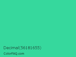 Decimal 56181655 Color is a normal green color and the nearest color is Shamrock #33cc99. Hex code #36d89d and RGB value is rgb(54,216,157). In RGB color space, this color is composed of 21% red, 85% green, 62% blue, In CMYK color space, this color is composed of 75% cyan, 0% magenta, 27% yellow , 15% black , In HSL color space, this color has a hue angle of 158° , 68% saturation and 53% lightness.
