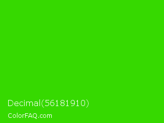 Decimal 56181910 Color is a normal green color and the nearest color is Harlequin Green #46cb18. Hex code #36d900 and RGB value is rgb(54,217,0). In RGB color space, this color is composed of 21% red, 85% green, 0% blue, In CMYK color space, this color is composed of 75% cyan, 0% magenta, 100% yellow , 15% black , In HSL color space, this color has a hue angle of 105° , 100% saturation and 43% lightness.