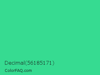 Decimal 56185171 Color is a normal green color and the nearest color is Shamrock #33cc99. Hex code #36db91 and RGB value is rgb(54,219,145). In RGB color space, this color is composed of 21% red, 86% green, 57% blue, In CMYK color space, this color is composed of 75% cyan, 0% magenta, 34% yellow , 14% black , In HSL color space, this color has a hue angle of 153° , 70% saturation and 54% lightness.