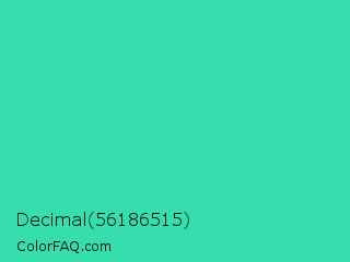 Decimal 56186515 Color is a normal green color and the nearest color is Eucalyptus #44d7a8. Hex code #36ddad and RGB value is rgb(54,221,173). In RGB color space, this color is composed of 21% red, 87% green, 68% blue, In CMYK color space, this color is composed of 76% cyan, 0% magenta, 22% yellow , 13% black , In HSL color space, this color has a hue angle of 163° , 71% saturation and 54% lightness.