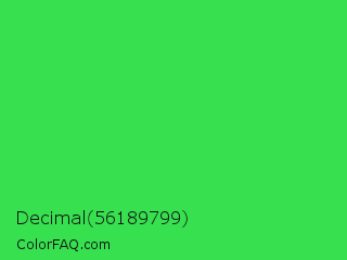 Decimal 56189799 Color is a normal green color and the nearest color is Lime Green #32cd32. Hex code #36e04f and RGB value is rgb(54,224,79). In RGB color space, this color is composed of 21% red, 88% green, 31% blue, In CMYK color space, this color is composed of 76% cyan, 0% magenta, 65% yellow , 12% black , In HSL color space, this color has a hue angle of 129° , 73% saturation and 55% lightness.