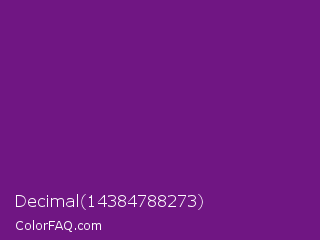 Decimal 14384788273 Color is a dark purple color and the nearest color is Seance #731e8f. Hex code #701683 and RGB value is rgb(112,22,131). In RGB color space, this color is composed of 44% red, 9% green, 51% blue, In CMYK color space, this color is composed of 15% cyan, 83% magenta, 0% yellow , 49% black , In HSL color space, this color has a hue angle of 290° , 71% saturation and 30% lightness.