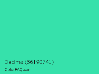 Decimal 56190741 Color is a normal green color and the nearest color is Eucalyptus #44d7a8. Hex code #36e1ab and RGB value is rgb(54,225,171). In RGB color space, this color is composed of 21% red, 88% green, 67% blue, In CMYK color space, this color is composed of 76% cyan, 0% magenta, 24% yellow , 12% black , In HSL color space, this color has a hue angle of 161° , 74% saturation and 55% lightness.