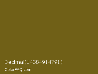 Decimal 14384914791 Color is a dark yellow color and the nearest color is Himalaya #6a5d1b. Hex code #706017 and RGB value is rgb(112,96,23). In RGB color space, this color is composed of 44% red, 38% green, 9% blue, In CMYK color space, this color is composed of 0% cyan, 14% magenta, 79% yellow , 56% black , In HSL color space, this color has a hue angle of 49° , 66% saturation and 26% lightness.