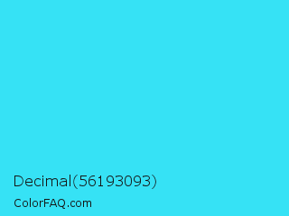 Decimal 56193093 Color is a normal cyan color and the nearest color is Loeen #15f2fd. Hex code #36e2f5 and RGB value is rgb(54,226,245). In RGB color space, this color is composed of 21% red, 89% green, 96% blue, In CMYK color space, this color is composed of 78% cyan, 8% magenta, 0% yellow , 4% black , In HSL color space, this color has a hue angle of 186° , 91% saturation and 59% lightness.
