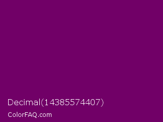 Decimal 14385574407 Color is a very dark magenta color and the nearest color is Cardinal Pink #8c055e. Hex code #710067 and RGB value is rgb(113,0,103). In RGB color space, this color is composed of 44% red, 0% green, 40% blue, In CMYK color space, this color is composed of 0% cyan, 100% magenta, 9% yellow , 56% black , In HSL color space, this color has a hue angle of 305° , 100% saturation and 22% lightness.