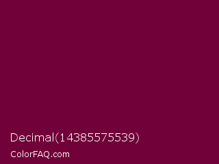 Decimal 14385575539 Color is a dark rose color and the nearest color is Siren #7a013a. Hex code #710239 and RGB value is rgb(113,2,57). In RGB color space, this color is composed of 44% red, 1% green, 22% blue, In CMYK color space, this color is composed of 0% cyan, 98% magenta, 50% yellow , 56% black , In HSL color space, this color has a hue angle of 330° , 97% saturation and 23% lightness.