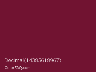 Decimal 14385618967 Color is a dark rose color and the nearest color is Claret #7f1734. Hex code #711331 and RGB value is rgb(113,19,49). In RGB color space, this color is composed of 44% red, 7% green, 19% blue, In CMYK color space, this color is composed of 0% cyan, 83% magenta, 57% yellow , 56% black , In HSL color space, this color has a hue angle of 341° , 71% saturation and 26% lightness.