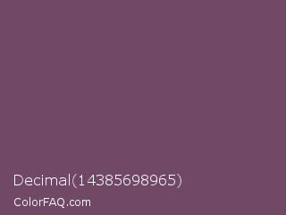 Decimal 14385698965 Color is a normal magenta color and the nearest color is Cosmic #76395d. Hex code #714967 and RGB value is rgb(113,73,103). In RGB color space, this color is composed of 44% red, 29% green, 40% blue, In CMYK color space, this color is composed of 0% cyan, 35% magenta, 9% yellow , 56% black , In HSL color space, this color has a hue angle of 315° , 22% saturation and 36% lightness.