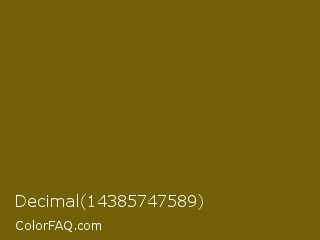 Decimal 14385747589 Color is a dark yellow color and the nearest color is Spicy Mustard #74640d. Hex code #716005 and RGB value is rgb(113,96,5). In RGB color space, this color is composed of 44% red, 38% green, 2% blue, In CMYK color space, this color is composed of 0% cyan, 15% magenta, 96% yellow , 56% black , In HSL color space, this color has a hue angle of 51° , 92% saturation and 23% lightness.