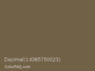 Decimal 14385750023 Color is a normal orange color and the nearest color is Tobacco Brown #715d47. Hex code #716147 and RGB value is rgb(113,97,71). In RGB color space, this color is composed of 44% red, 38% green, 28% blue, In CMYK color space, this color is composed of 0% cyan, 14% magenta, 37% yellow , 56% black , In HSL color space, this color has a hue angle of 37° , 23% saturation and 36% lightness.