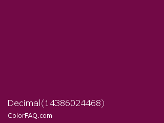 Decimal 14386024468 Color is a dark magenta color and the nearest color is Rose Bud Cherry #800b47. Hex code #720946 and RGB value is rgb(114,9,70). In RGB color space, this color is composed of 45% red, 4% green, 27% blue, In CMYK color space, this color is composed of 0% cyan, 92% magenta, 39% yellow , 55% black , In HSL color space, this color has a hue angle of 325° , 85% saturation and 24% lightness.