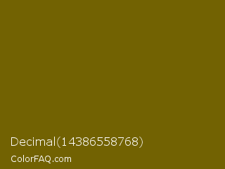 Decimal 14386558768 Color is a dark yellow color and the nearest color is Spicy Mustard #74640d. Hex code #726202 and RGB value is rgb(114,98,2). In RGB color space, this color is composed of 45% red, 38% green, 1% blue, In CMYK color space, this color is composed of 0% cyan, 14% magenta, 98% yellow , 55% black , In HSL color space, this color has a hue angle of 51° , 97% saturation and 23% lightness.