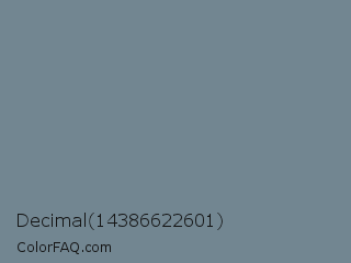 Decimal 14386622601 Color is a normal blue color and the nearest color is Slate Gray #708090. Hex code #728691 and RGB value is rgb(114,134,145). In RGB color space, this color is composed of 45% red, 53% green, 57% blue, In CMYK color space, this color is composed of 21% cyan, 8% magenta, 0% yellow , 43% black , In HSL color space, this color has a hue angle of 201° , 12% saturation and 51% lightness.