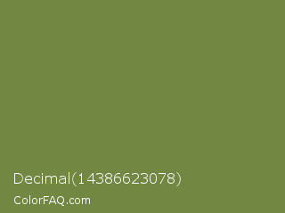 Decimal 14386623078 Color is a normal lime color and the nearest color is Palm Leaf #6f9940. Hex code #728742 and RGB value is rgb(114,135,66). In RGB color space, this color is composed of 45% red, 53% green, 26% blue, In CMYK color space, this color is composed of 16% cyan, 0% magenta, 51% yellow , 47% black , In HSL color space, this color has a hue angle of 78° , 34% saturation and 39% lightness.