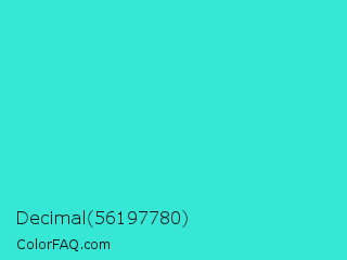 Decimal 56197780 Color is a normal cyan color and the nearest color is Turquoise #40e0d0. Hex code #36e7d6 and RGB value is rgb(54,231,214). In RGB color space, this color is composed of 21% red, 91% green, 84% blue, In CMYK color space, this color is composed of 77% cyan, 0% magenta, 7% yellow , 9% black , In HSL color space, this color has a hue angle of 174° , 79% saturation and 56% lightness.