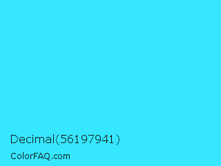 Decimal 56197941 Color is a light cyan color and the nearest color is Loeen #15f2fd. Hex code #36e7ff and RGB value is rgb(54,231,255). In RGB color space, this color is composed of 21% red, 91% green, 100% blue, In CMYK color space, this color is composed of 79% cyan, 9% magenta, 0% yellow , 0% black , In HSL color space, this color has a hue angle of 187° , 100% saturation and 61% lightness.