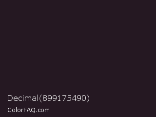 Decimal 899175490 Color is a very dark magenta color and the nearest color is Raisin Black #242124. Hex code #251822 and RGB value is rgb(37,24,34). In RGB color space, this color is composed of 15% red, 9% green, 13% blue, In CMYK color space, this color is composed of 0% cyan, 35% magenta, 8% yellow , 85% black , In HSL color space, this color has a hue angle of 314° , 21% saturation and 12% lightness.