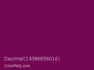 Decimal 14386856016 Color is a dark magenta color and the nearest color is Rose Bud Cherry #800b47. Hex code #730752 and RGB value is rgb(115,7,82). In RGB color space, this color is composed of 45% red, 3% green, 32% blue, In CMYK color space, this color is composed of 0% cyan, 94% magenta, 29% yellow , 55% black , In HSL color space, this color has a hue angle of 318° , 89% saturation and 24% lightness.