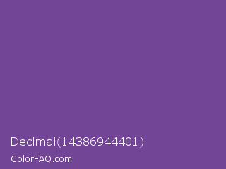 Decimal 14386944401 Color is a normal purple color and the nearest color is Affair #714693. Hex code #734597 and RGB value is rgb(115,69,151). In RGB color space, this color is composed of 45% red, 27% green, 59% blue, In CMYK color space, this color is composed of 24% cyan, 54% magenta, 0% yellow , 41% black , In HSL color space, this color has a hue angle of 274° , 37% saturation and 43% lightness.