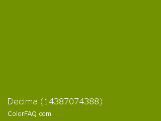 Decimal 14387074388 Color is a dark lime color and the nearest color is Limeade #6f9d02. Hex code #739202 and RGB value is rgb(115,146,2). In RGB color space, this color is composed of 45% red, 57% green, 1% blue, In CMYK color space, this color is composed of 21% cyan, 0% magenta, 99% yellow , 43% black , In HSL color space, this color has a hue angle of 73° , 97% saturation and 29% lightness.