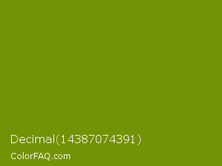 Decimal 14387074391 Color is a dark lime color and the nearest color is Limeade #6f9d02. Hex code #739205 and RGB value is rgb(115,146,5). In RGB color space, this color is composed of 45% red, 57% green, 2% blue, In CMYK color space, this color is composed of 21% cyan, 0% magenta, 97% yellow , 43% black , In HSL color space, this color has a hue angle of 73° , 93% saturation and 30% lightness.