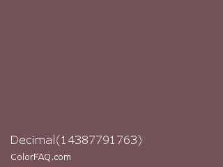 Decimal 14387791763 Color is a normal red color and the nearest color is Russett #755a57. Hex code #745259 and RGB value is rgb(116,82,89). In RGB color space, this color is composed of 45% red, 32% green, 35% blue, In CMYK color space, this color is composed of 0% cyan, 29% magenta, 23% yellow , 55% black , In HSL color space, this color has a hue angle of 348° , 17% saturation and 39% lightness.
